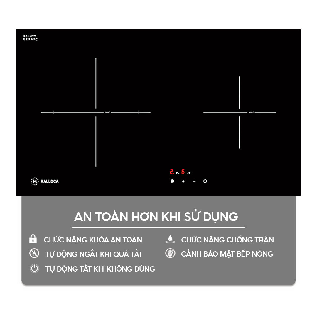 Chức năng Cảnh báo dư nhiệt: Bếp cảnh báo người dùng không chạm tay vào vùng nóng, giảm thiểu khả năng rủi ro bị bỏng.