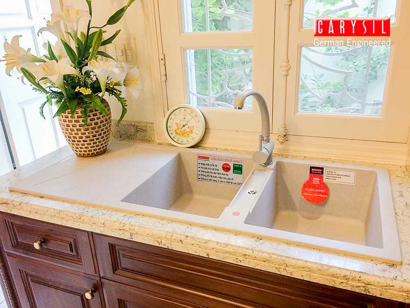 Công nghệ hàng đầu của Đức Chất liệu làm từ bột đá Granite cao cấp Thiết kế lắp âm tinh tế và sang trọng Hệ thống 2 bồn rửa và 1 bàn chờ Độ bền rất cao, chống các tác nhân bên ngoài Đặc tính kháng khuẩn cao Đảm bảo an toàn cho sức khỏe của người sử dụng Không bị xuống màu trong quá trình sử dụng Dễ dàng vệ sinh bồn rửa Chống thấm hiệu quả Khả năng chịu nhiệt cao lên đến 230 độ C Hệ thống màu gồm 3 màu Hiện tại và tiện lợi cho hộ gia đình |