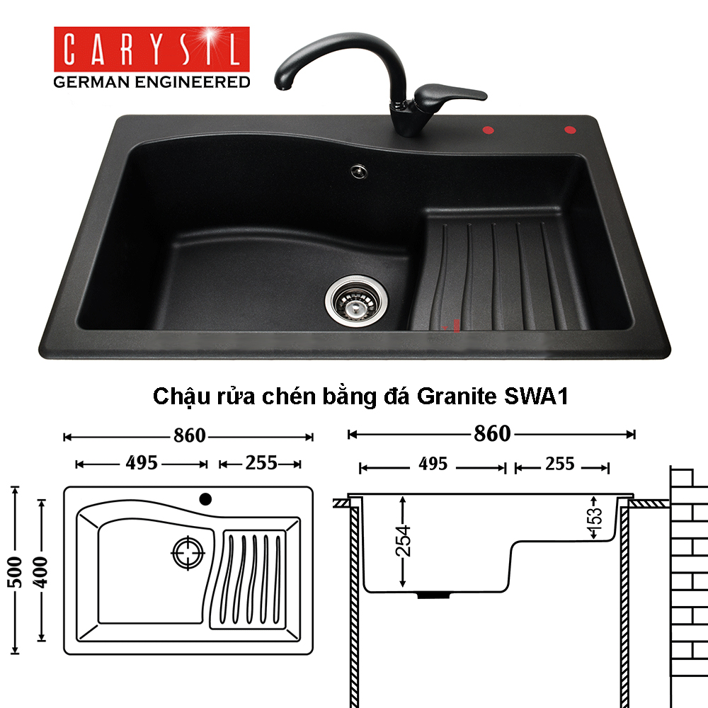 Bồn rửa bằng đá nhân tạo New Ascend Bowl SWA1-03/Nera Đen với thiết kế thông minh với hệ thống thoát nước nhanh chóng, tránh tình trạng ứ, nghẹt, lỗ chống tràn, thoải mái sử dụng mà nước không bị tràn ra xung quanh bếp nhà bạn…Một hố rửa, cho bạn sử dụng được linh hoạt hơn, đa năng, cộng một bàn chờ lắp nổi sát ngay bên bồn rửa, được sử dụng nhiều trong không gian bếp nấu hiện đại, sang trọng. Là dòng chậu 1 hố, 1 bàn cao cấp của Carysil, chất liệu được làm bằng bột đá và lắp đặt inset. Thiết kế đồng bộ với các loại vòi rửa Carysil chính hãng. Đây là sản phẩm được sản xuất chính là để cung cấp và đáp ứng nhu cầu rửa giặc cho mọi khách hàng, với chất liệu và thiết kế như vậy thì đây quả là một sản phẩm mà bạn cẩn nên sắm ngay cho nhà bếp của gia đình bạn.