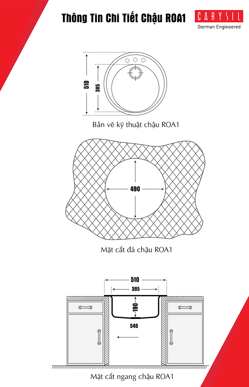 | Kích thước khoét đá | Hình tròn 490 mm |
