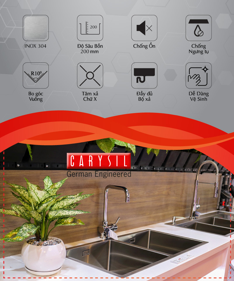 Bồn rửa bằng inox MQ9 sở hữu chất liệu Inox 304 cùng với độ dày của chậu 1.2mm độ bền rất cao, không trầy xước, móp méo trong thời gian sử dụng là sản phẩm đáng tin cậy của mọi nhà. Carysil MQ9 là dòng sản phẩm mới được chế tạo bán thủ công tỉ mỉ từ Carysil. Đặc biệt hơn thế, Chậu rửa chén trang bị thêm lớp chống ồn làm cho không gian bếp trở nên yên tĩnh cùng với bộ phận chống ngưng tụ nước phía dưới đáy chậu. Rỗ lọc của của Carysil IC-MQ9 làm bằng Inox tiện lợi, bộ xả thông minh ngăn mùi hiệu quả.