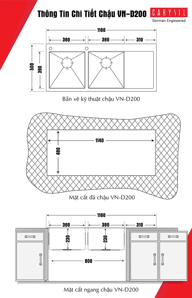 Có 2 lỗ dập sắn trên chậu Dòng sản phẩm mới được chế tạo bán thủ công tỉ mỉ từ Carysil Có lớp chống ồn và chống ngưng tụ nước dưới đáy chậu Bộ xả thông minh ngăn mùi hiệu quả Dễ dàng vệ sinh, đồng bộ màu sắc với vòi mạ crom Carysil |