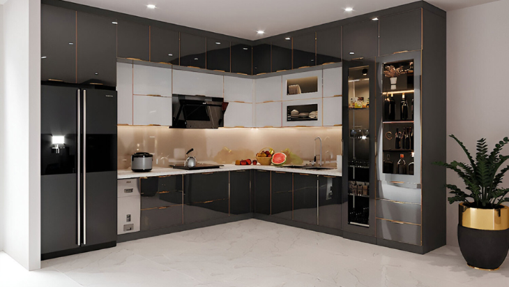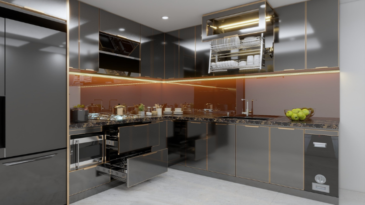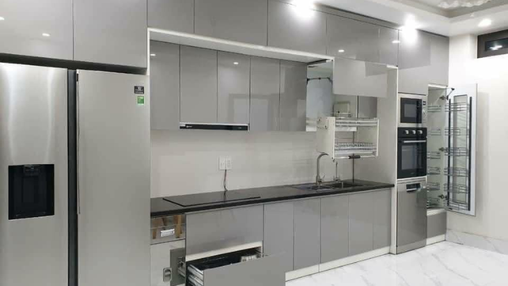 Tủ bếp thông minh: Tích hợp nhiều chức năng như giá đỡ, ray trượt, kệ xoay, thùng rác... giúp tối ưu hóa không gian lưu trữ, dễ dàng sắp xếp và lấy đồ.