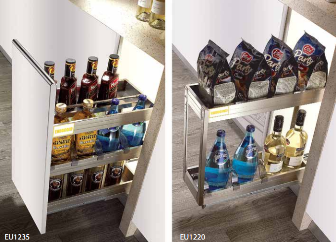 • Thiết kế khá nhỏ gọn, giúp bạn tận dụng được tối không gian lưu trữ hệ tủ bếp dưới. Giá gia vị Eurogold EU1235 được thiết kế bao gồm giá và hệ thống ray trượt giảm chấn. Việc sử dụng giá ( kéo ra/ đẩy vào) trở nên êm ái mà vô cùng nhẹ nhàng.