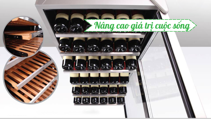 Kệ gỗ tự nhiên: Kệ gỗ tự nhiên giúp bảo vệ chai rượu và tạo sự thông thoáng bên trong tủ.