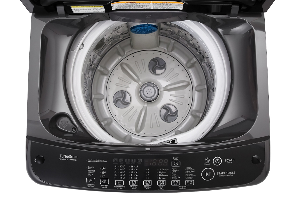 Máy giặt LG TurboDrum Inverter 9 kg T2109VSAB thuộc kiểu máy giặt lồng đứng cùng với bảng điều khiển nằm ở phía trước quen thuộc, chất liệu vỏ máy được làm bằng kim loại sơn tĩnh điện bền bỉ và giảm thiểu tình trạng trầy xước trong quá trình sử dụng.