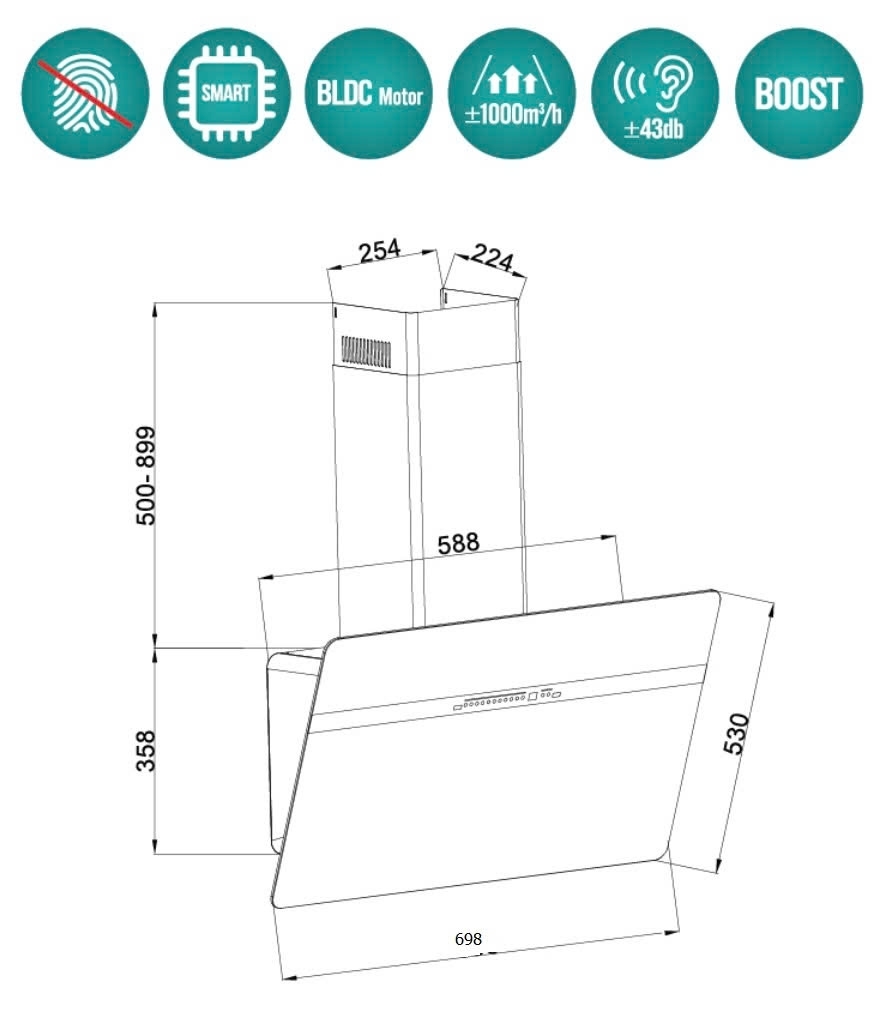 | Loại sản phẩm | Máy hút mùi kính vát |