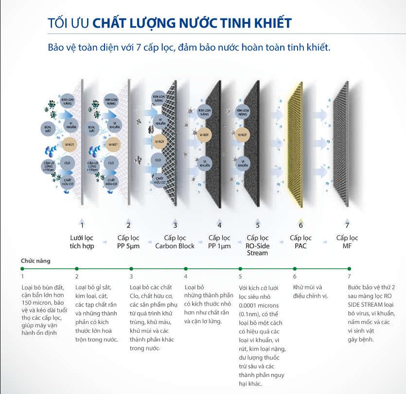 ➤ Vì màng lọc RO – Side Stream có kích thước các lưới lọc chỉ 0.0001 microns nên có thể loại bỏ đến 99.99% các vi khuẩn, virus độc hại.