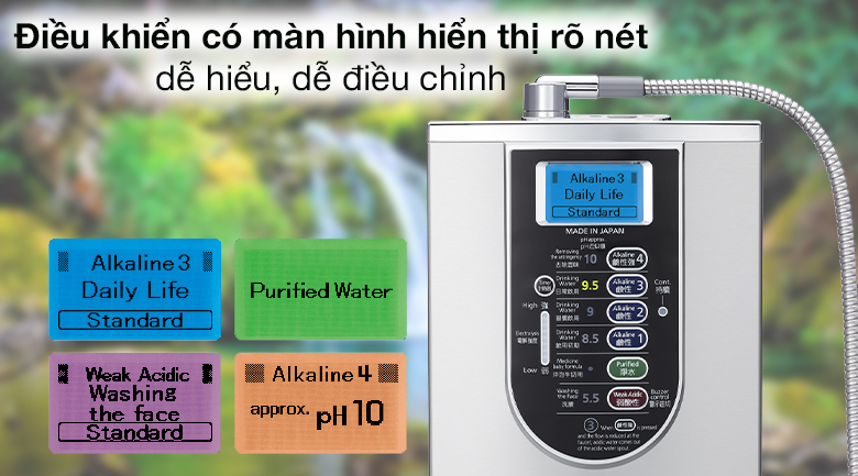 | Số loại nước: | 7 loại: nước kiềm (4 mức), nước tinh khiết, nước tính axit |