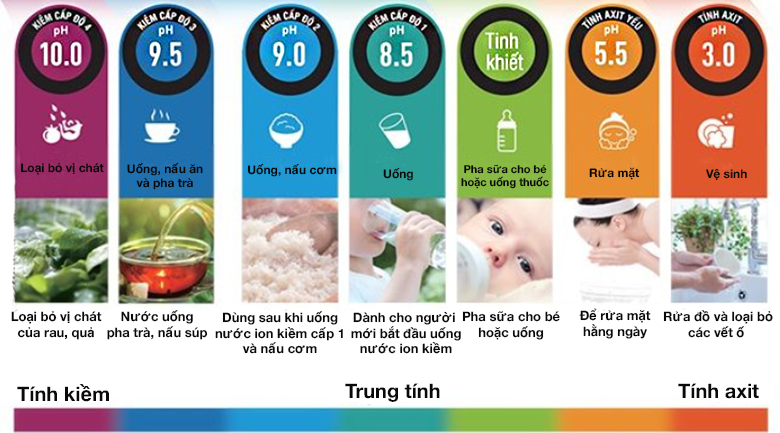 - Nước ion kiềm cấp độ 3 (độ pH 9.5): Uống thường xuyên hằng ngày giúp tăng sức đề kháng, trung hòa axit dư thừa và hỗ trợ điều trị các bệnh liên quan đến tiêu hóa. Ngoài ra, nước còn dùng để pha trà, pha cà phê với khả năng chiết xuất hương vị đặc trưng của thức uống.