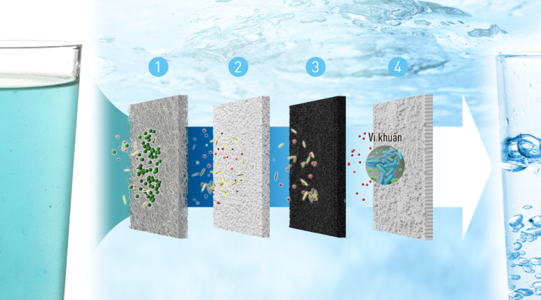 Hệ thống lọc tiên tiến 4 giai đoạn: vải không dệt, sứ, than hoạt tính và màng sợi rỗng đảm bảo chất lượng nước an toàn để sử dụng ngay sau lọc.