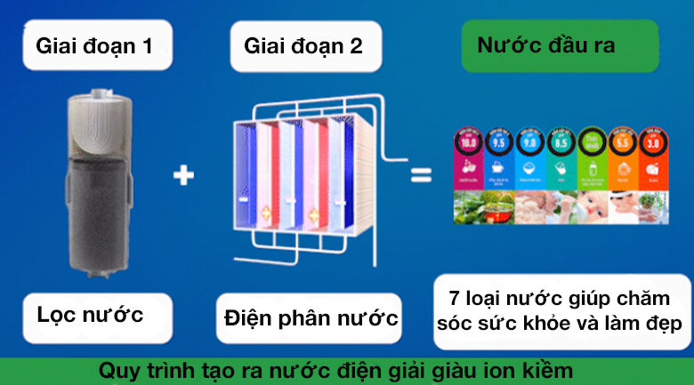 Giai đoạn 2 - điện phân nước: nước đầu vào sau khi được lọc sạch sẽ vào buồng điện phân công suất cao với 5 tấm điện cực để phân tách các phân tử nước và tái cấu trúc các phân tử nước, nước ion kiềm được sản sinh ở cực âm, nước ION AXIT (nước có tính axit) sẽ được sản sinh ở cực dương.