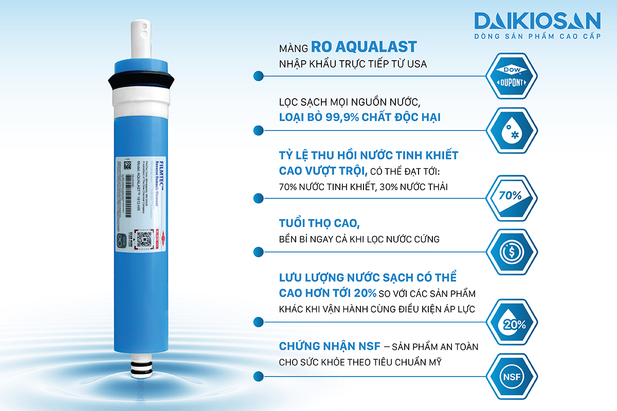 Đặc biệt, máy sở hữu “trái tim” màng RO Dow được nhập khẩu từ tập đoàn Dupont (DOW) của Mỹ - đơn vị hàng đầu thế giới về giải pháp xử lý nước. Màng lọc này có kích cỡ từ 0.1 – 0.5 nanomet chỉ cho phép các phân tử nước đi qua và lọc sạch các chất lơ lửng, chất có hại hòa tan trong nước … Đặc biệt, đây là loại màng RO siêu tiết kiệm nước thải hàng đầu giúp tăng tới 133% lượng nước tinh khiết thu hồi được so với màng lọc thông thường và tiết kiệm đến 82% lượng nước thải.