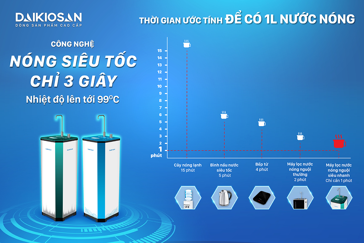 Nhờ ứng dụng công nghệ làm nóng nước bằng Film hiện đại bậc nhất nên Máy lọc nước nóng nguội siêu nhanh Daikiosan DSW-43210I có khả năng làm nóng nước chỉ trong 3 giây. Chỉ cần nhấn nút là ngay lập tức lấy được nước sôi lên tới 99°C mà không phải chờ đợi nấu nước, tiết kiệm tiền điện một cách tối đa nhất.