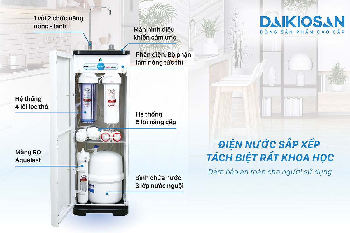 Daikiosan DSW-43210I sử dụng công nghệ lọc RO hiện đại cùng hệ thống 10 cấp lọc nước tạo ra nguồn nước sạch đạt chuẩn nước uống trực tiếp và cung cấp đầy đủ khoáng chất cho cơ thể.