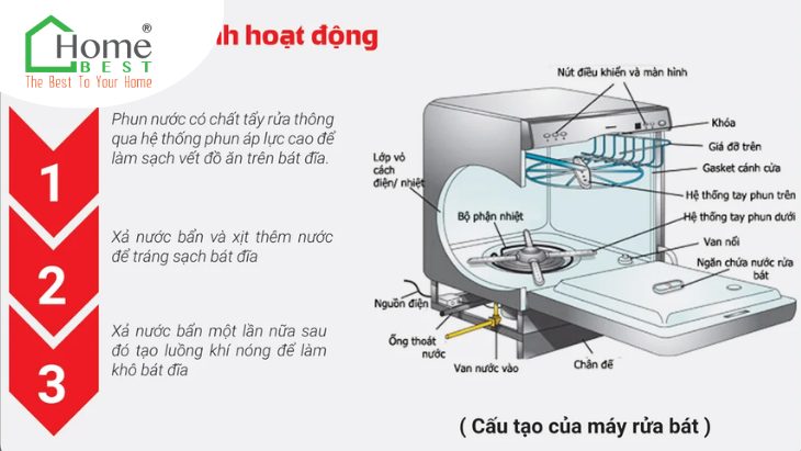 2. Nguyên lý hoạt động của máy rửa bát: Máy rửa bát hoạt động dựa trên dòng nước phun áp lực cao. Máy dùng chất tẩy rửa chuyên dụng kết hợp với tay phun sẽ phun tia nước áp lực cao để làm sạch mọi vết bẩn bám trên bát đĩa. Sau đó, máy sẽ dùng nước nóng để tráng sạch bát chén. Cuối cùng, máy sẽ tạo luồng khí nóng để làm khô chén đĩa hoàn toàn và diệt khuẩn.