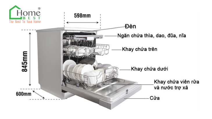 - Phần khung máy, tay cầm, hệ thống bảng điều khiển, khoang máy, tay phun trên, tay phun dưới, bộ lọc, ngăn chứa nước trợ xả, rổ đựng bát đĩa, khay đựng muối rửa, ngăn chứa bột rửa.