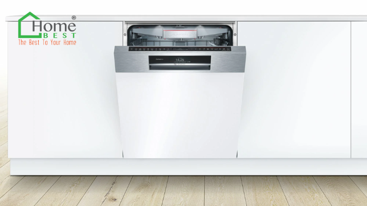 - Máy rửa chén âm tủ bán phần: có phần thân được lắp vào trong tủ bếp, phần cửa máy hiện ra ngoài, bảng điều khiển nằm bên ngoài.