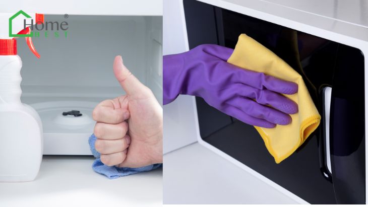 Vệ sinh khoang lò bằng khăn ẩm để loại bỏ cặn thức ăn và dầu mỡ.