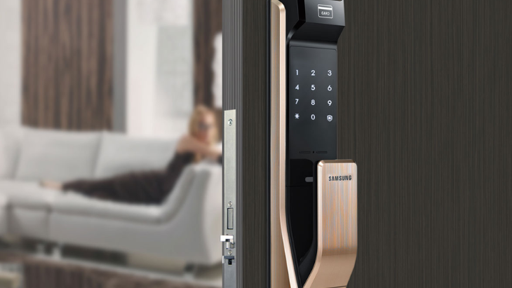 Ưu điểm: Thiết kế sang trọng, hiện đại. Mở khóa bằng nhiều phương thức: vân tay, mật khẩu, thẻ từ, chìa cơ, app SmartThings. Tích hợp camera giám sát. Chống nước, chống bụi, chống cháy tốt