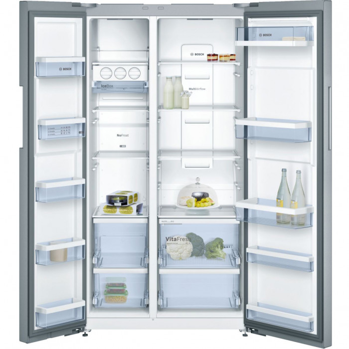 Tủ lạnh 2 cánh side by side Bosch HMH.KAN92VI35O sử dụng hệ thống khí lạnh đa chiều đưa khí lạnh tới mọi thực phẩm tươi lâu, không bị héo úa. Ngoài ra, bộ lọc mùi Airfresh giữ nguyên hương vị thực phẩm, an toàn với sức khỏe. Bạn có thể sử dụng chức năng làm mát nhanh Super Cooling và làm lạnh nhanh SuperFreeze thông qua bảng điều khiển điện tử bên ngoài cánh tủ. Đặc biệt, tủ có chế độ cảnh báo khi mở tủ quá lâu để tiết kiệm năng lượng, phòng trường hợp trẻ nhỏ mở cửa tủ quá lâu. Đèn LED chiếu sáng bên trong, đem lại ánh sáng đều cho toàn bộ nội thất bên trong giúp bạn có thể sử dụng được cả khi môi trường xung quanh thiếu ánh sáng. Tủ còn có chế độ kỳ nghỉ nếu tủ ít dùng hoặc đủ hơi lạnh.