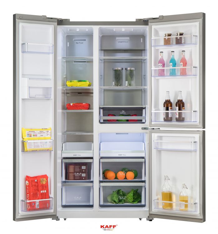 Tủ lạnh ba cánh Kaff KF-BCD580W có thiết kế lưới mắt cáo của ngăn cân bằng độ ẩm cho rau củ luôn tươi ngon như vừa mua về sẽ lưu giữ lại lượng hơi ẩm lý tưởng cho ngăn chứa, nhờ vậy những món rau củ quả của bạn sẽ luôn giữ được độ tươi ngon, mọng nước như vừa mua về. Một lợi thế khi sử dụng tủ lạnh Kaff KF-BCD580W cho mọi gia đình đó nữa là tiết kiệm điện năng đến 20% so với các sản phẩm khác. Ngoài ra, tủ lạnh còn có công nghệ chống đông tuyết (Frost free) giúp bạn sử dụng được hoàn toàn 100% không gian dự trữ thực phẩm, giúp bảo quản thực phẩm tốt hơn, người dùng còn không cần quá lo lắng về việc tốn thời gian vệ sinh xả đông mệt mỏi và phức tạp. Có đầy đủ mọi tính năng an toàn nên tủ lạnh Kaff KF-BCD580W là sự lựa chọn hoàn hảo cho gia đình.